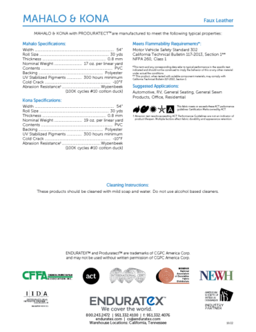 - Nominal Weight: Mahalo 17 oz per linear yard – Kona 19 oz per linear yard
