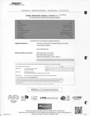 • Abrasion Resistance*: Wyzenbeek (100K cycles #10 cotton duck)
