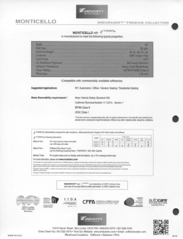 - Abrasion Resistance*: Wyzenbeek (100K cycles #10 cotton duck)